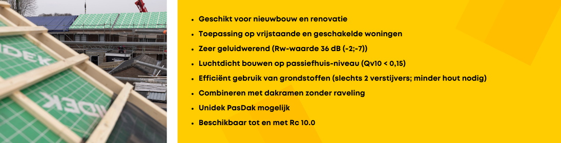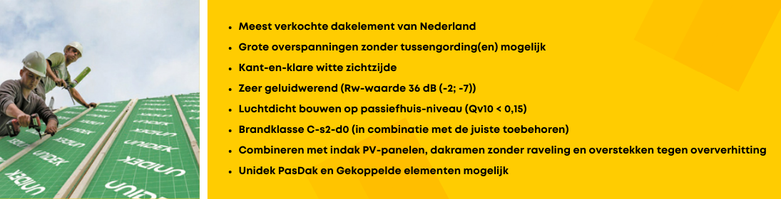 Unidek Aero PD is geschikt voor platte en licht hellende daken van nieuwbouwwoningen. De dakelementen bevatten een kern van brandvertragend gemodificeerd EPS Platinum en zijn voorzien van 4 geintegreerde verstijvers. De buitenzijde is voorzien van een 12mm OSB III. De binnenzijde is voorzien van een 12mm gipskartonplaat die tussen 2 verstijvers is aangebracht. De dakelementen zijn afgewerkt met een 3mm spaanplaat voorzien van een witte zichtzijde met een geintegreerd dampremmende laag.