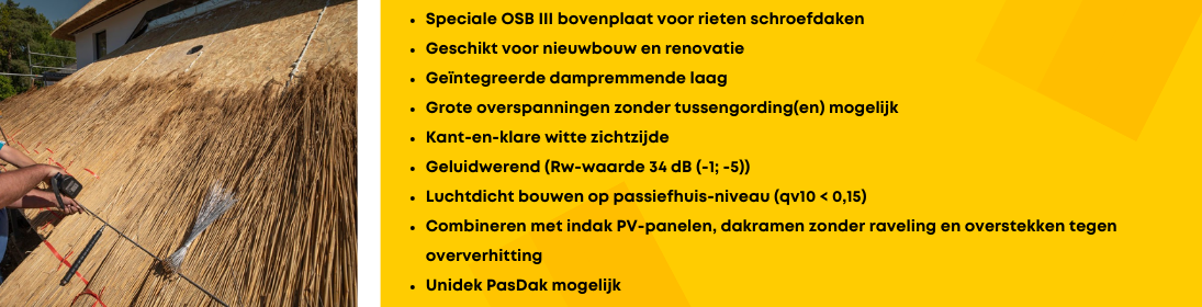 Unidek Aero Riet is een isolerend alles-in-1 dakelement met een kern van brandvertragend gemodificeerd EPS Platinum, voorzien van 4 geintegreerde verstijvers. De buitenzijde is voorzien van een 12mm OSB III. De binnenzijde is afgewerkt met een 3mm spaanplaat, voorzien van een witte zichtzijde met geintegreerde dampremmende laag.