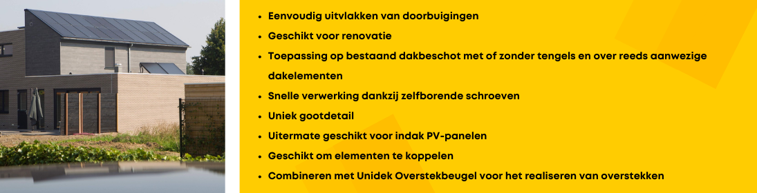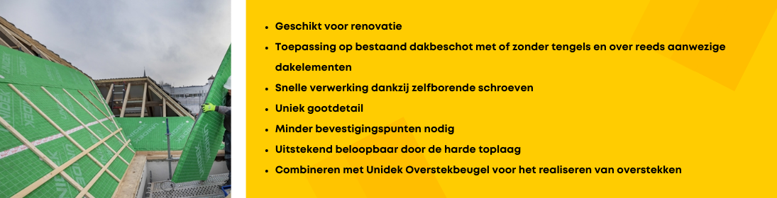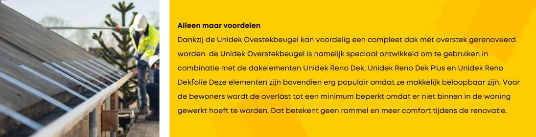Met de Unidek Overstekbeugel creëert u op een snelle en efficiënte manier een stevige overstek bij de dakvoet van woningen. Deze beugel is geschikt voor gebruik met Unidek Reno Dek, Reno Dek Plus of Unidek Reno Dekfolie. Door het doordachte ontwerp is de montage bijzonder eenvoudig. Bovendien maakt de slimme constructie in combinatie met een gootplank het mogelijk om het overstek te belopen.