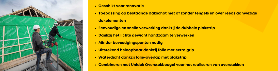 Unidek Reno Dekfolie is een isolerend dakelement met een kern van brandvertragend gemodificeerd EPS Platinum. De buitenzijde van de dakelementen zijn voorzien van een waterkerende damp-open groene folie met ruitmotief en 2 tengels van 15mm hoog en 45mm breed. De dakplaat is aan de gootzijde voorzien van een sponning, de hoogte van deze sponning is afhankelijk van de Rc-waarde van het dakelement. Aan een langszijde (links) is het dakelement voorzien van een folie-overlap van 75mm met plakstrip ten behoeve van de naadafdichting. Aan de rechterzijde is het dakelement voorzien van een plakstrip, hierdoor kunnen de dakplaten netjes tegen elkaar aan gemonteerd worden.