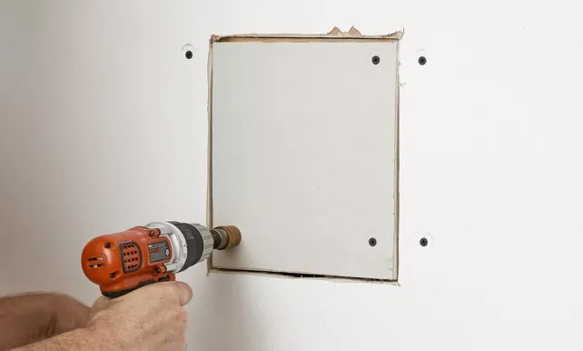 Duw het uitgezaagde plaatje in het gat en schroef deze d.m.v. het schroefbitje met gipsplaatschroeven op de supportlatten.
