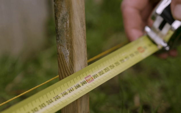 Verwijder de ‘oude’ hoekpalen en sla rond de bekisting opnieuw tuinpalen in de grond, op 10 cm vanaf de hoekpunten. Plaats halverwege de bekistingstroken ook een paal. Sla de palen ruim 80 cm diep de grond in.