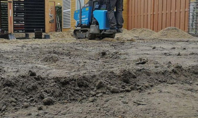 Vul de uitgegraven plekken met 10 cm metselzand of ophoogzand. Zorg ervoor dat deze zandlaag 5 cm onder het maaiveld uitkomt. Stamp of tril het zand goed aan en strijk de nieuwe laag glad met een vloerrij.