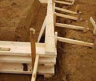 Graaf tussen de paaltjes op de hoeken een smalle sleuf waarin de bekisting gezet wordt. Steek hierin de stroken betonplex in molenwiekverband. Laat de stroken 5 cm boven het maaiveld uitsteken. Controleer vervolgens of alle hoeken haaks zijn en de stroken goed waterpas staan. Vul als laatste de sleuven op met metselzand en druk dit stevig aan.